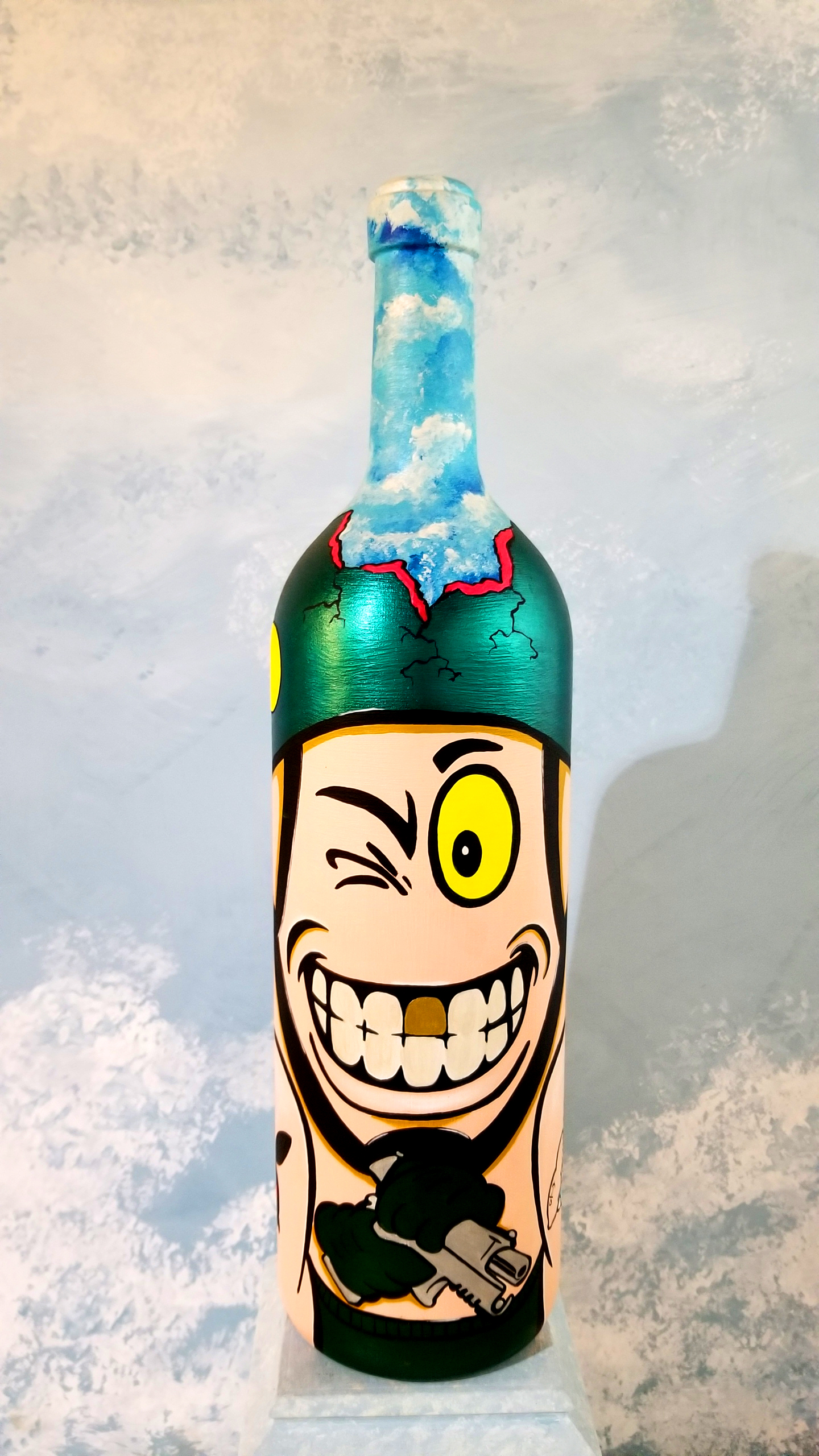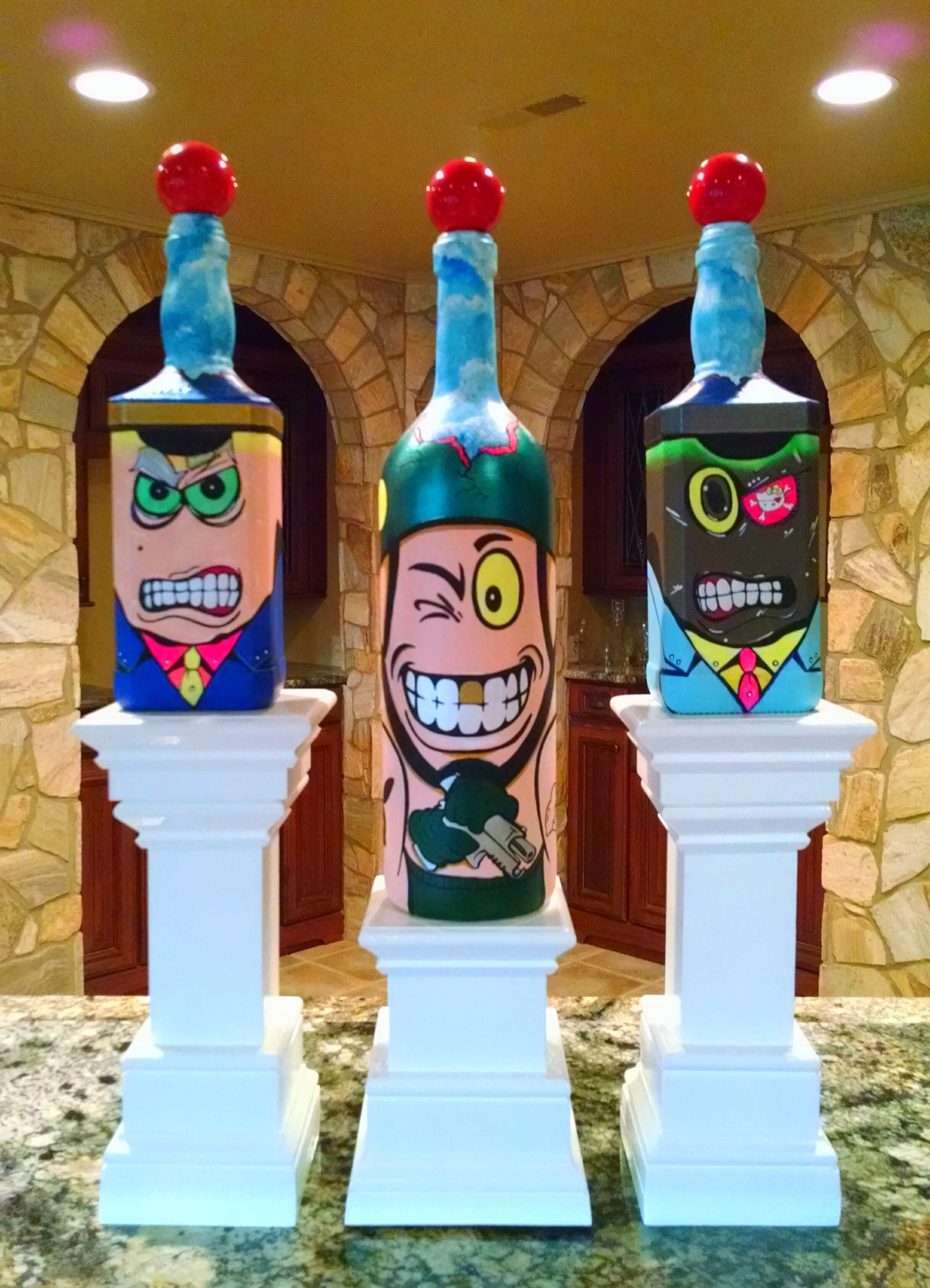 Each of these bottle paintings is a unique conception and is a one of a kind piece of work.  Each has their own personality twist, and all of them are collaboratively created, hand painted, and original works of art by Joey and Rhonda Havlock.