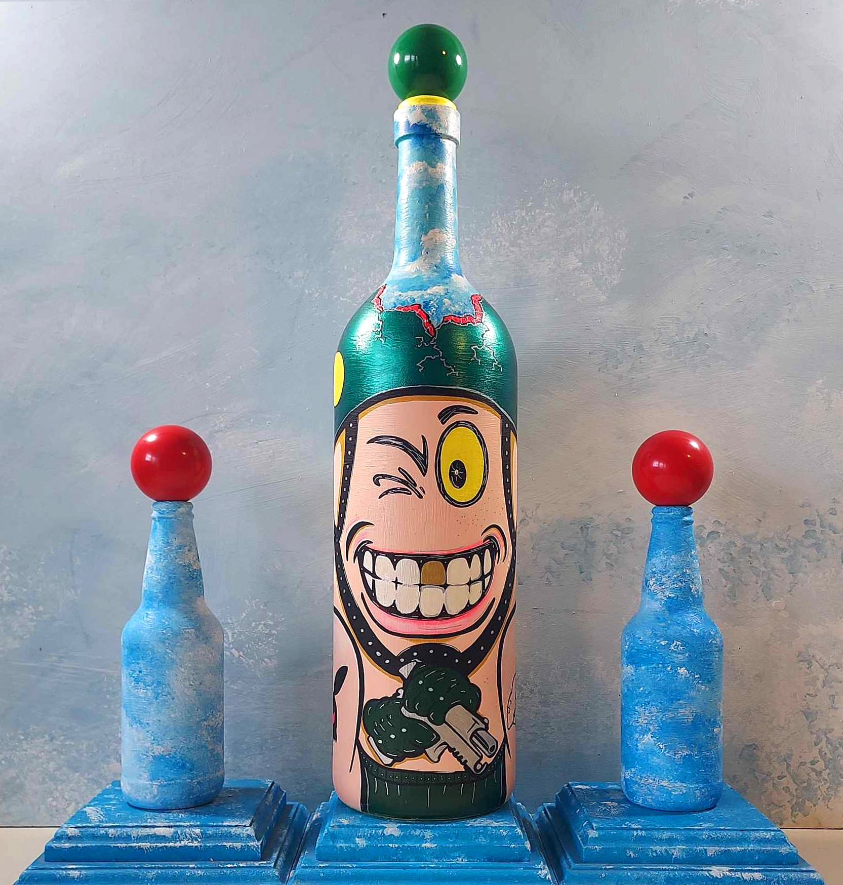 MEDIA: Acrylic, Ink & Oil Painting on Glass Bottle.  Removable and interchangeable glass and resin marbles.